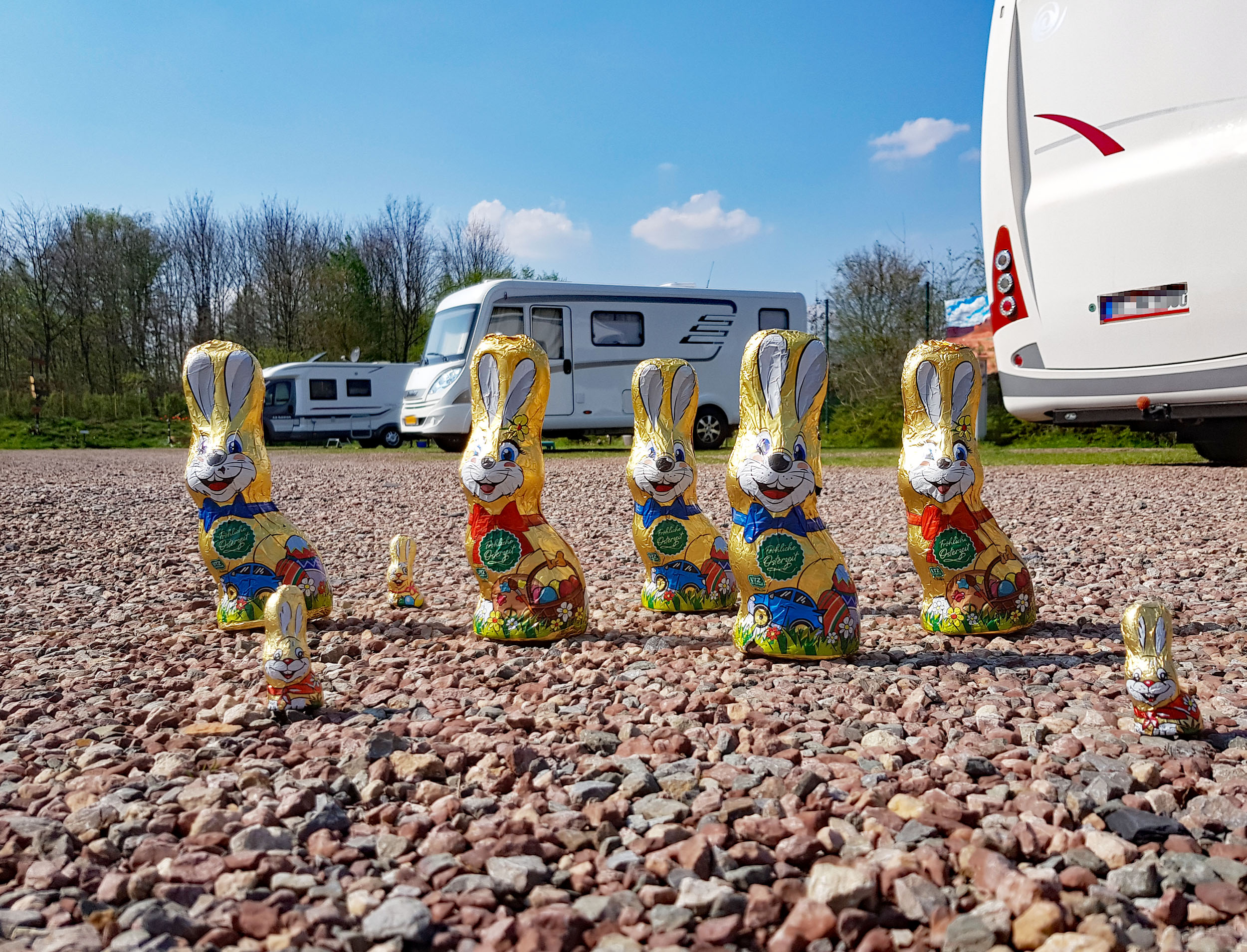 Wie schon im letzten Jahr erhält jeder Gast bei uns auf dem Stellplatz natürlich einen Osterhasen aus Schokolade. Schon seit einigen Tagen kann man sich den Schoko-Hasen bei der Anmeldung im Fasshaus nehmen. Er ist nicht zu übersehen und befindet sich gleich bei den Teebeuteln und den Betthupferln, an denen man sich natürlich bedienen darf. Natürlich nur, so lange der Vorrat reicht.