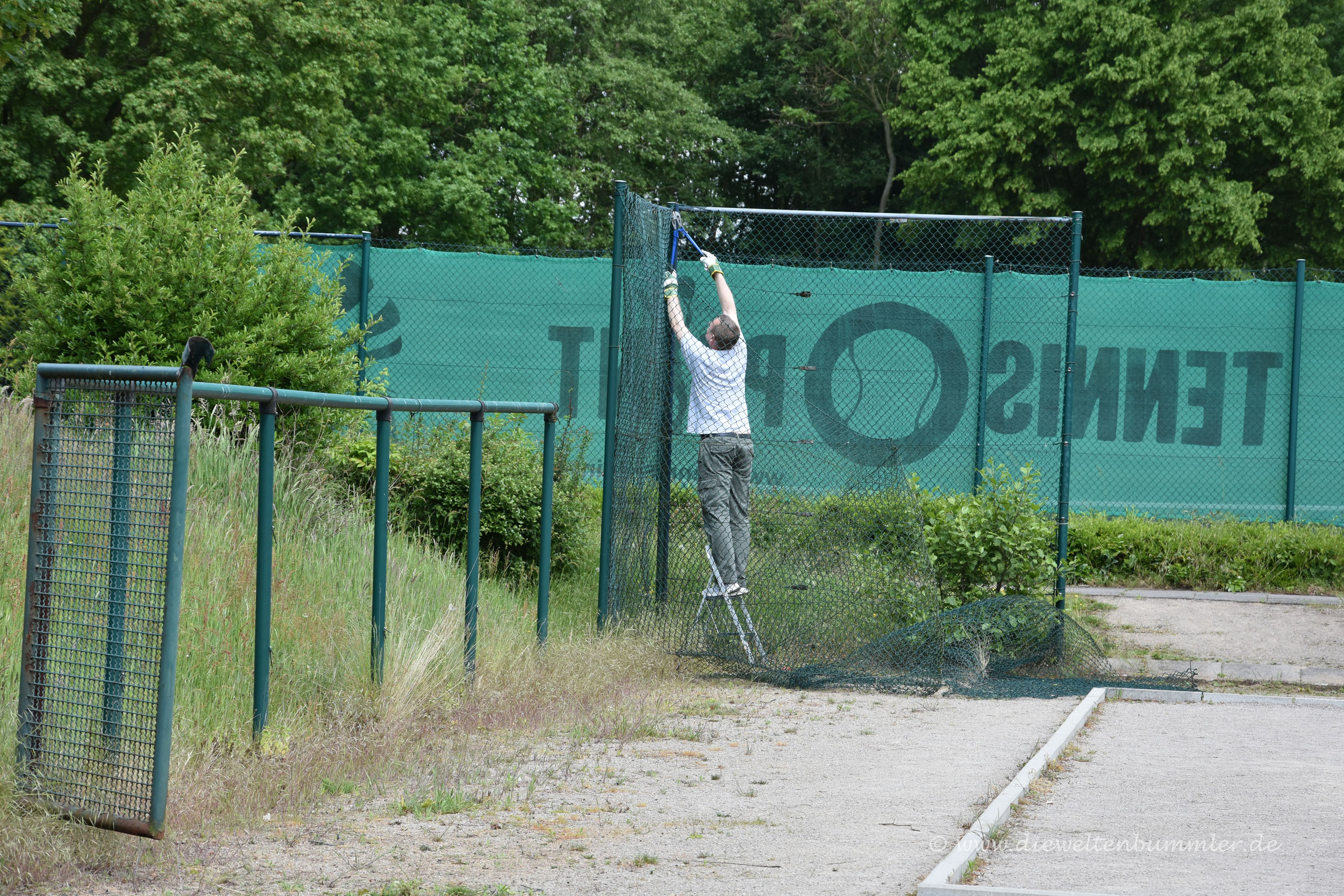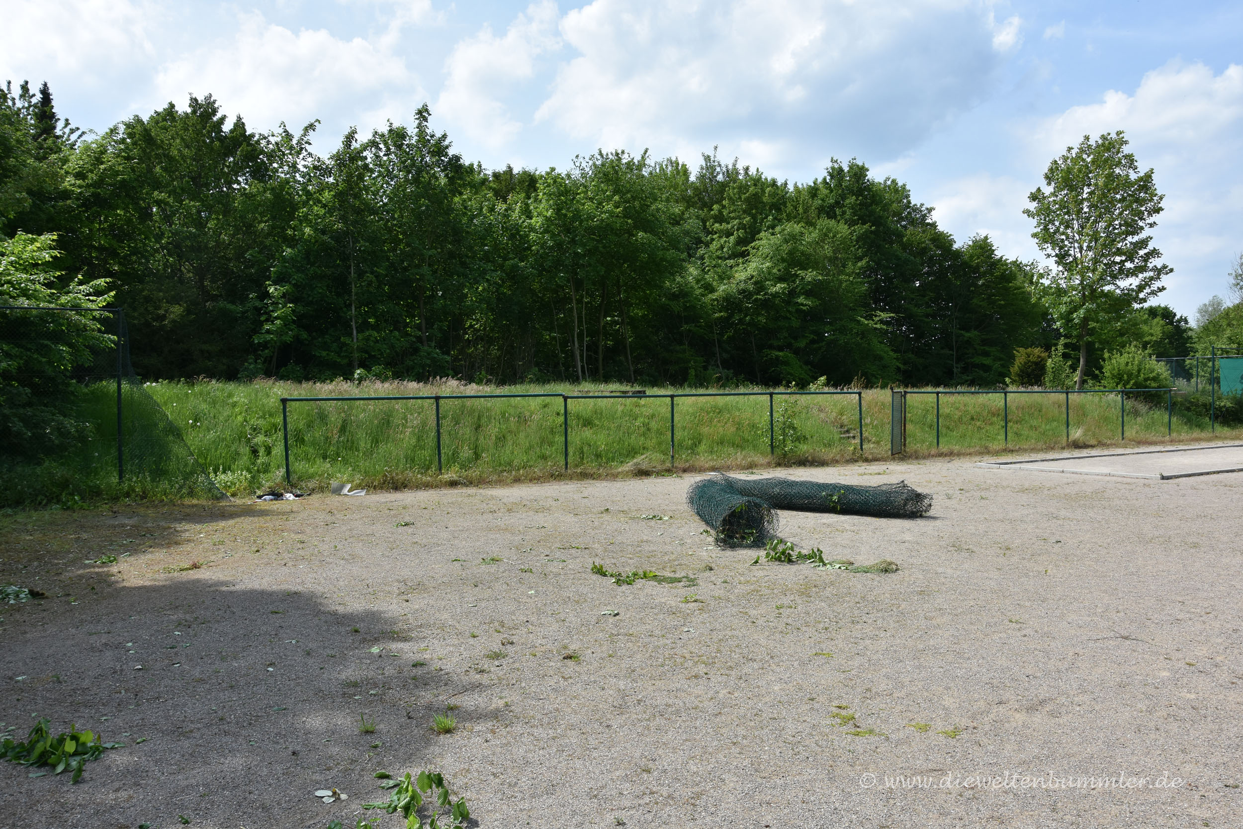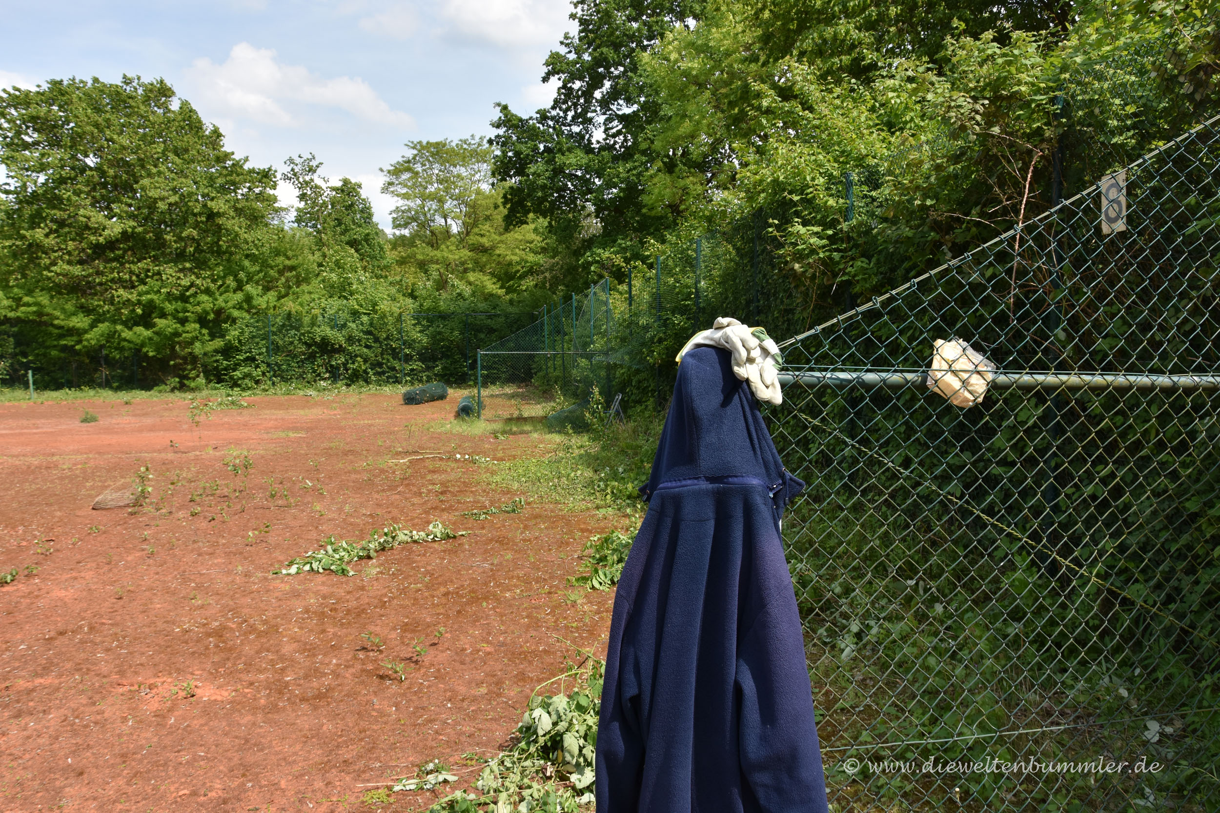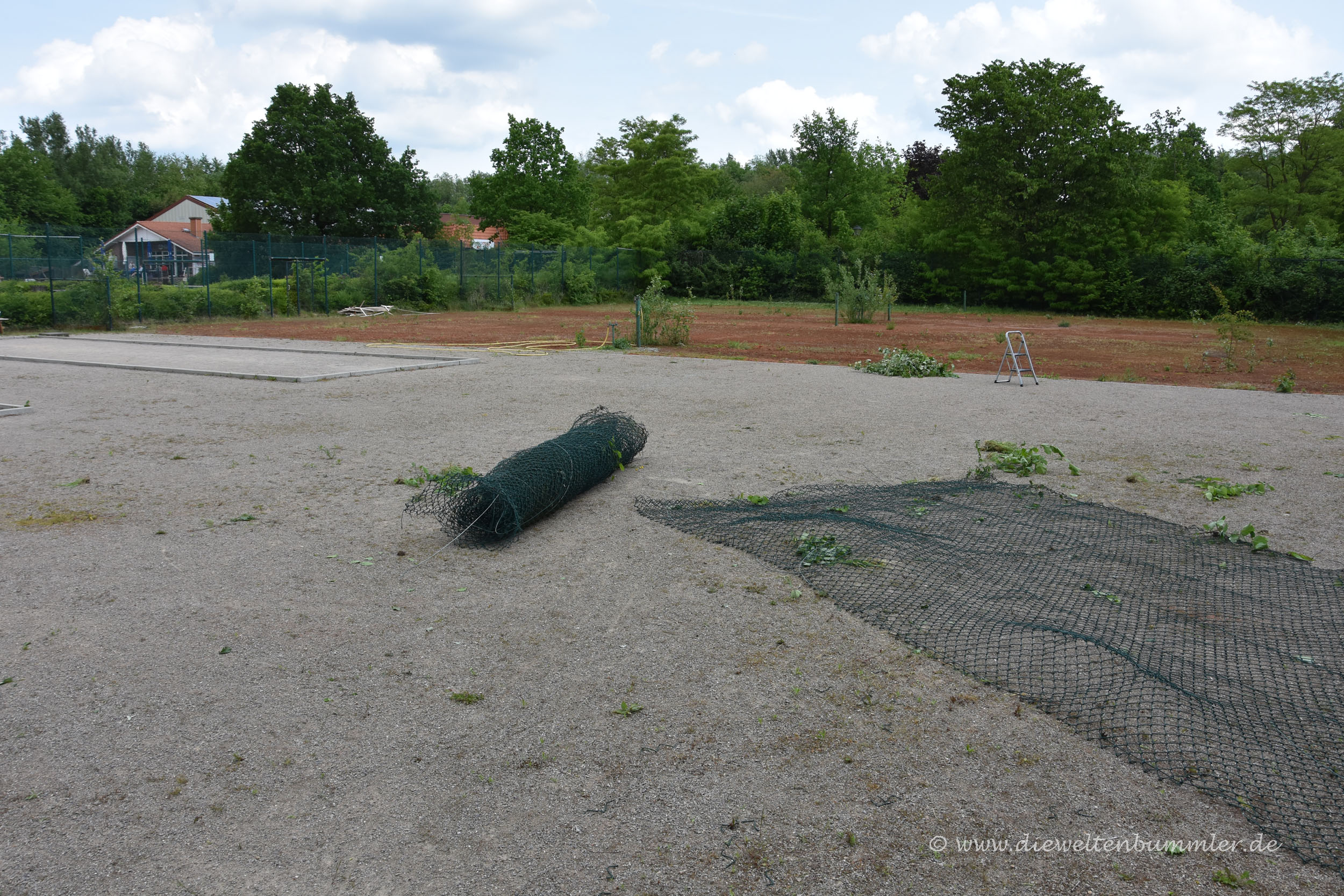Heute werfen wir daher einen Blick zurück auf unseren ersten Arbeitstag vor Ort. Es war heiß, die Sonne prallte auf ehemalige Tennis- und Bouleplätze, die noch von einem hohen Zaun umgeben waren. Dieser Zaun musste weg.