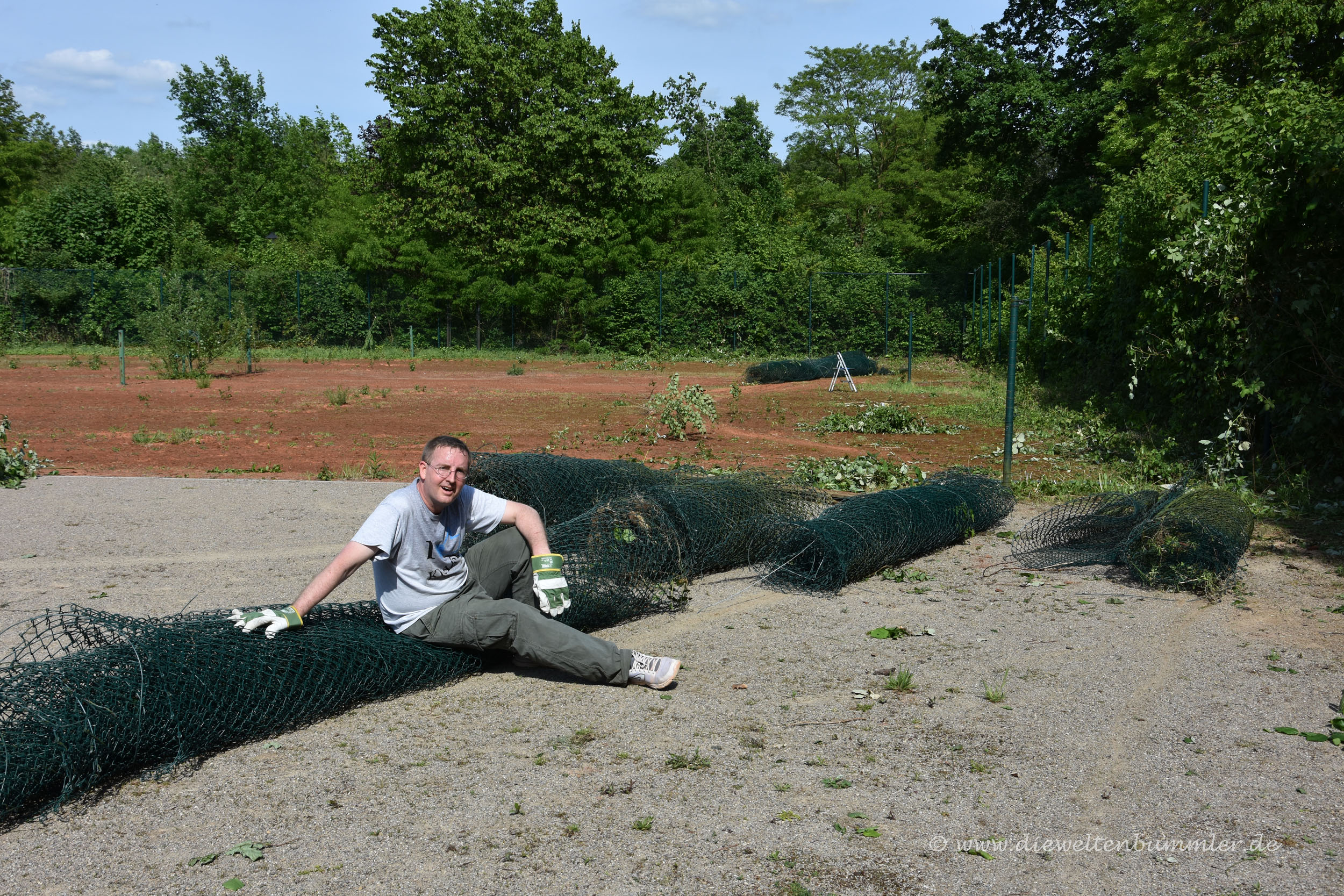 Mangels Stromanschluss nutzten wir einen Generator, der uns die Energie für die Flex erzeugte. Und am Ende des Schweiß treibenden Tages hatten wir sehr viel Maschendrahtzaun, der später von einem Schrotthändler abgeholt wurde.