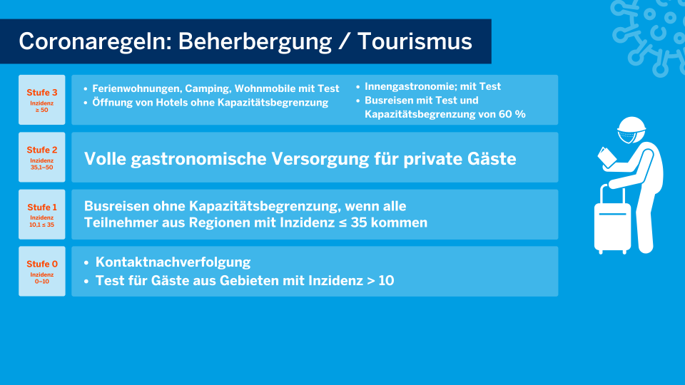Die Kurzform lautet, dass Reisende, die aus einer Stadt oder einem Landkreis mit einer Inzidenz geringer als 10 problemlos bei uns übernachten können. Ist die Inzidenz im Herkunftsort höher als 10, dann ist ein Impfnachweis oder ein negativer Coronatest erforderlich.