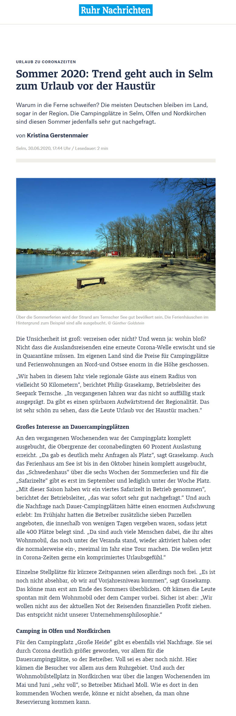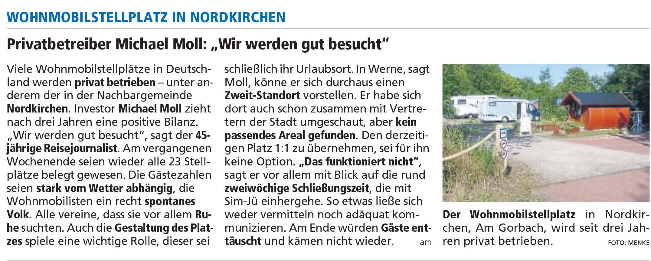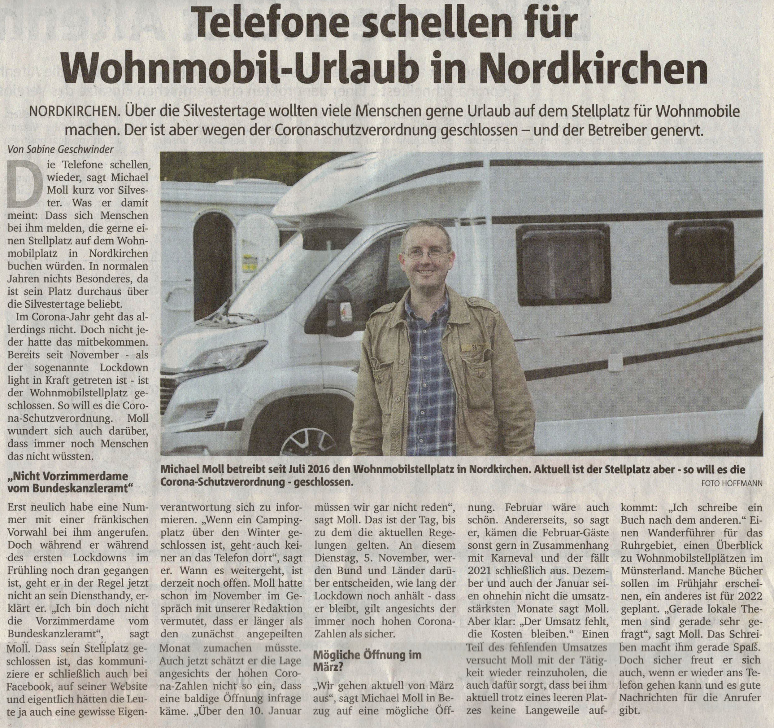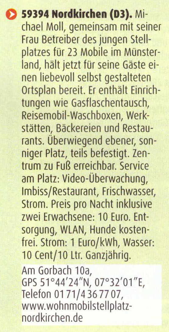 Ruhrnachrichten vom 20. März 2020 Ruhrnachrichten vom 30. Oktober 2019 Westfälischer Anzeiger vom 13. August 2019 Ruhrnachrichten vom 8. August 2019 promobil-Ausgabe 06/2018 Ruhrnachrichten vom 11. Mai 2018 Westfälischer Anzeiger vom 9. Dezember 2017 Ruhrnachrichten vom 8. Dezember 2017 Ruhrnachrichten vom 17. Juli 2017 Promobil „Stellplatz des Monats“, Ausgabe Juni 2017 Ruhrnachrichten vom 9. Mai 2017 Promobil, Ausgabe Januar 2017 Promobil, Ausgabe Dezember 2016 Mobilszene, Ausgabe Oktober 2016 Nordkirchen life, Ausgabe September 2016 Ruhrnachrichten vom 2. September 2016 Reisemobil international, Ausgabe Juli 2016 Westfälischer Anzeiger vom 19. Juli 2016 Ruhrnachrichten vom 20. Mai 2016 Ruhrnachrichten vom 22. April 2016 Ruhrnachrichten vom 6. April 2016 Ruhrnachrichten vom 11. Dezember 2015 Westfälischer Anzeiger vom 30. April 2015 Ruhrnachrichten vom 23. April 2015 Ruhrnachrichten vom 18. April 2015 Westfälischer Anzeiger vom 10. April 2015