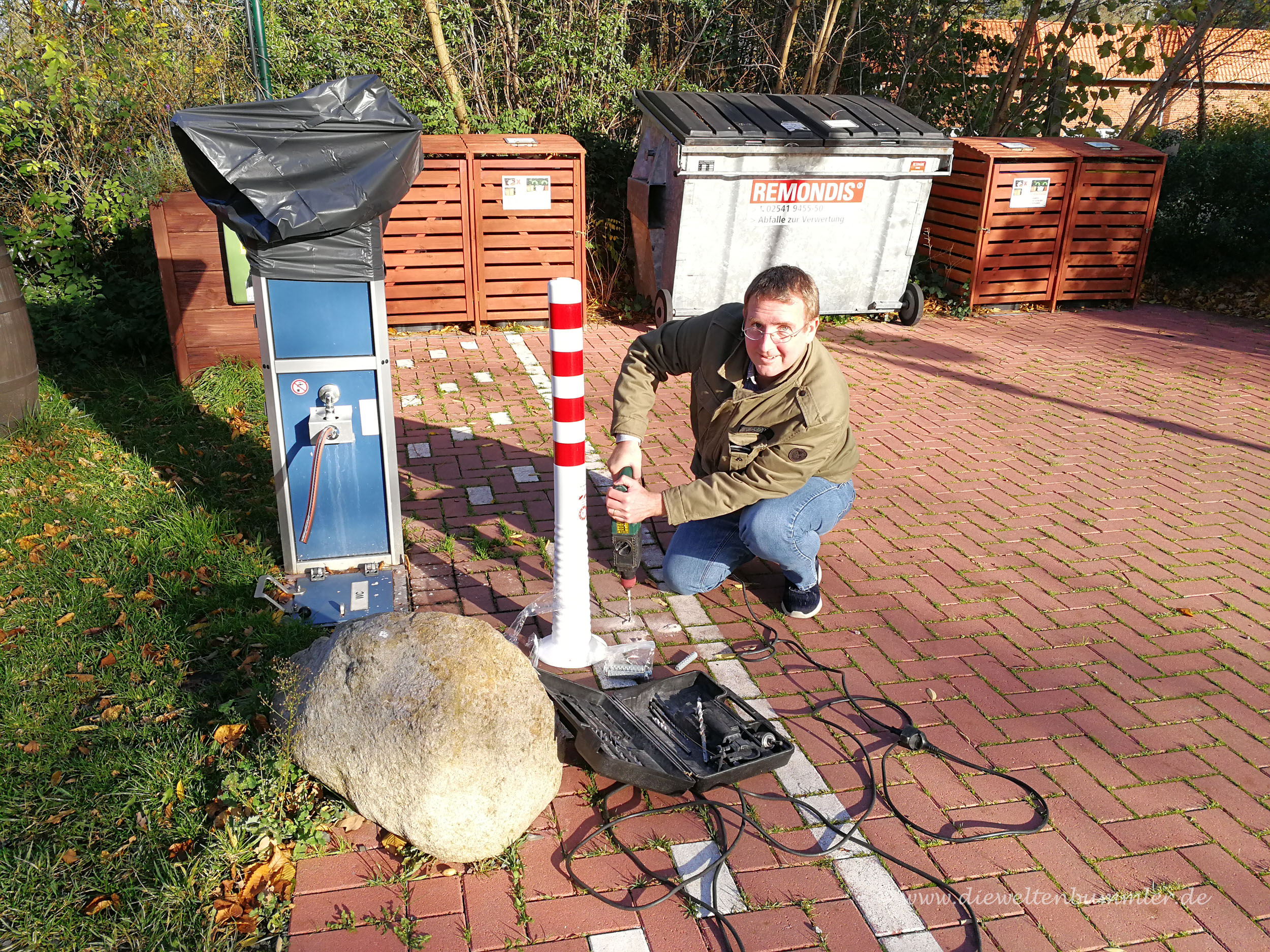 Er soll der besseren Sichtbarkeit auf unserer Ver- und Entsorgungsstation dienen, gleichzeitig aber auch unsere Wassersäule vor Kontakt mit Wohnmobilen schützen. Doch keine Sorge, wenn er mal angerempelt wird, passiert nichts. Der Pfosten ist komplett aus Kunststoff und flexibel.